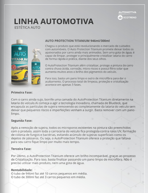 O Auto Protection TITANIUM USA limpa e Cristaliza superfícies lisas através da sua exclusiva fórmula com tecnologia Blueteck, em sua primeira etapa, encapsula as micro-partículas de sujeira removendo-a sem danificar a pintura, e em sua segunda etapa preenche os microporos da pintura dando brilho e proteção contra dejetos e raios UV. Todo processo sem utilização de uma gota d’água, preservando o meio ambiente. Este produto é a chave para a estética automotiva do seu veículo.